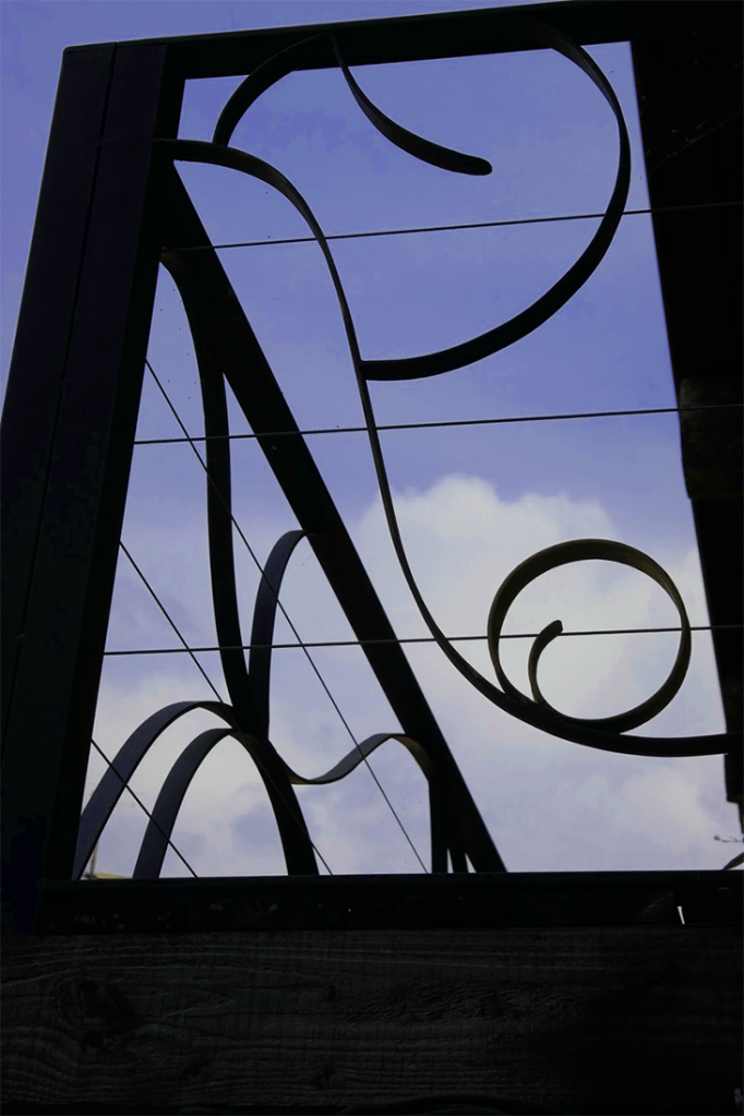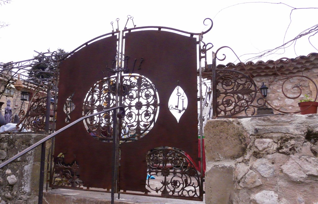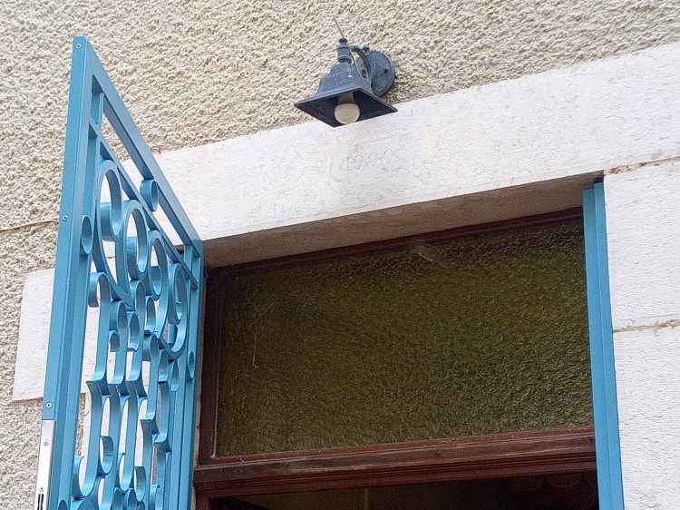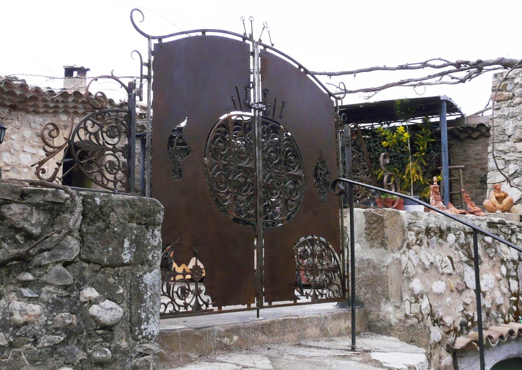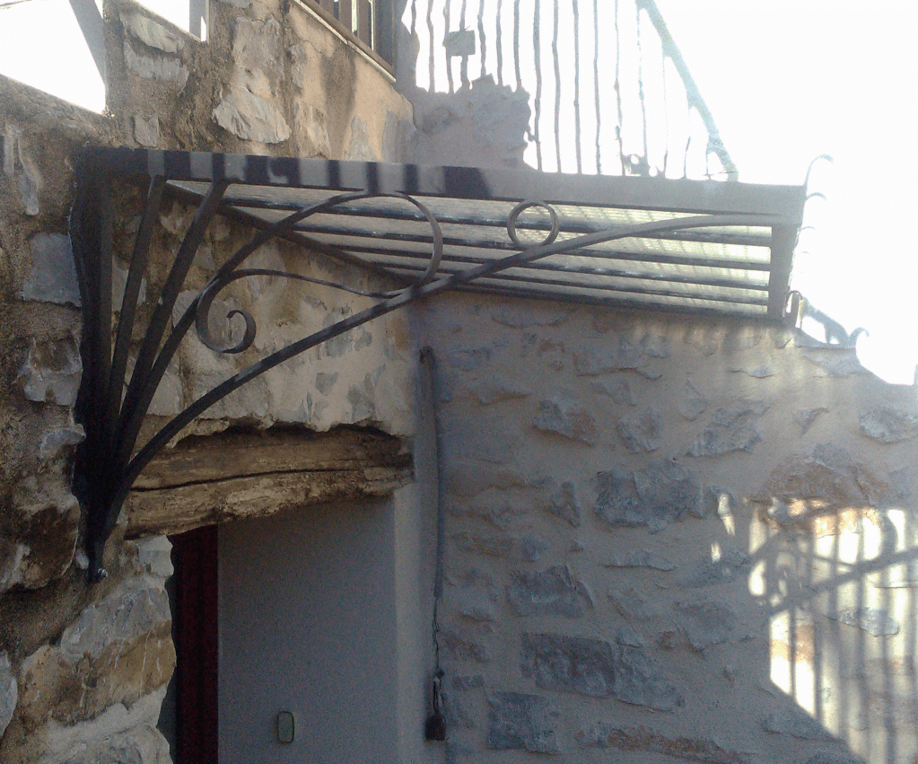 Une marquise aux décorations inspirées par l’esthétique Art Nouveau, sur une maison provençale en pierres apparentes. Finition noir mat.