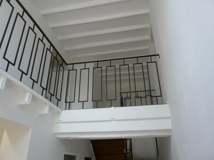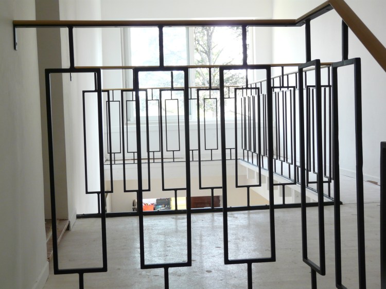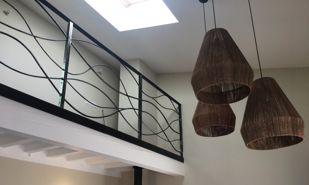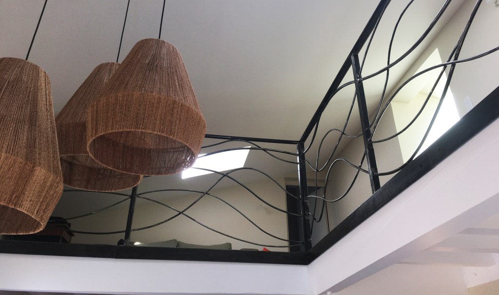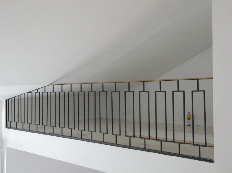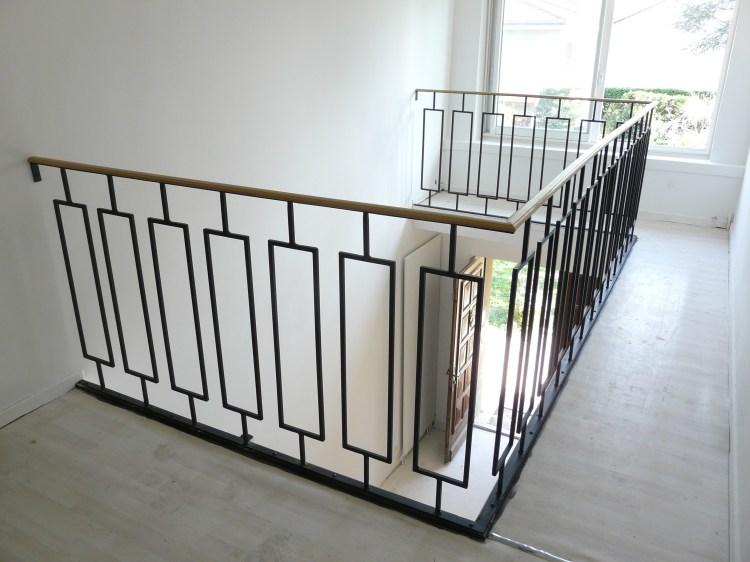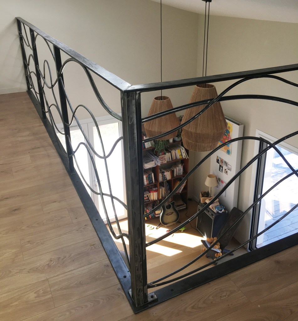 Une rambarde simple, à l’intérieur, finition thermolaquage effet rouille.