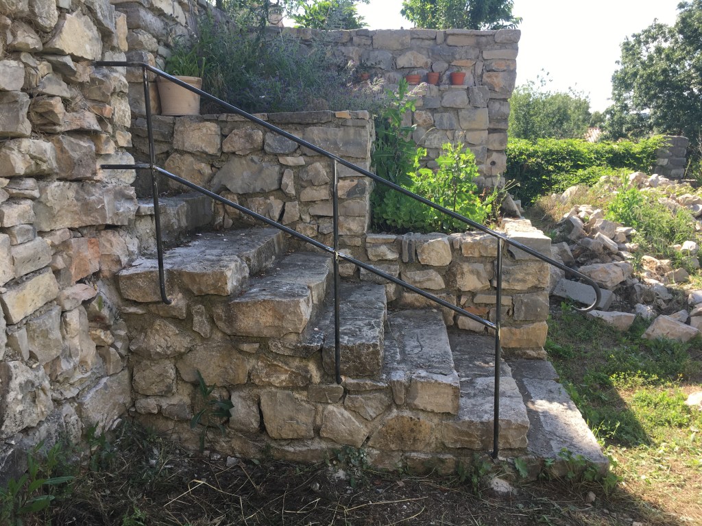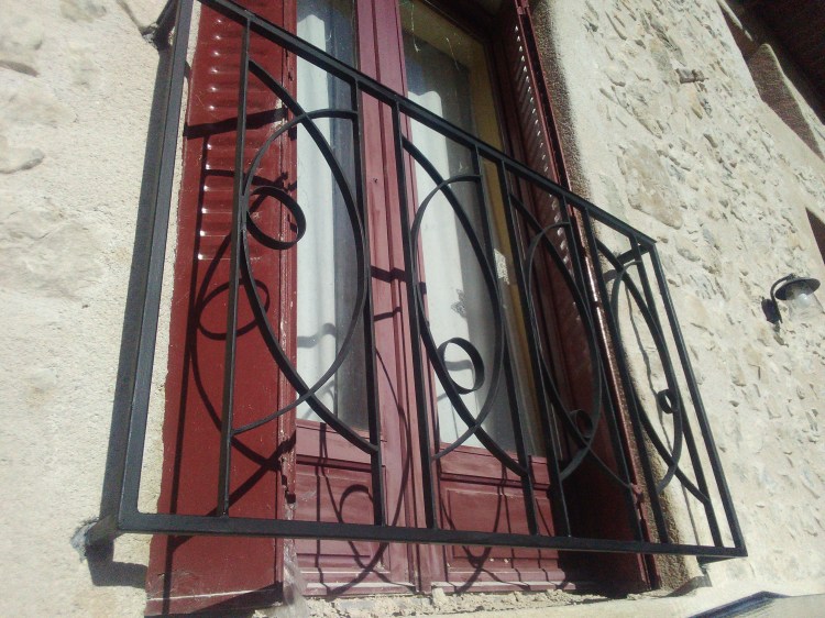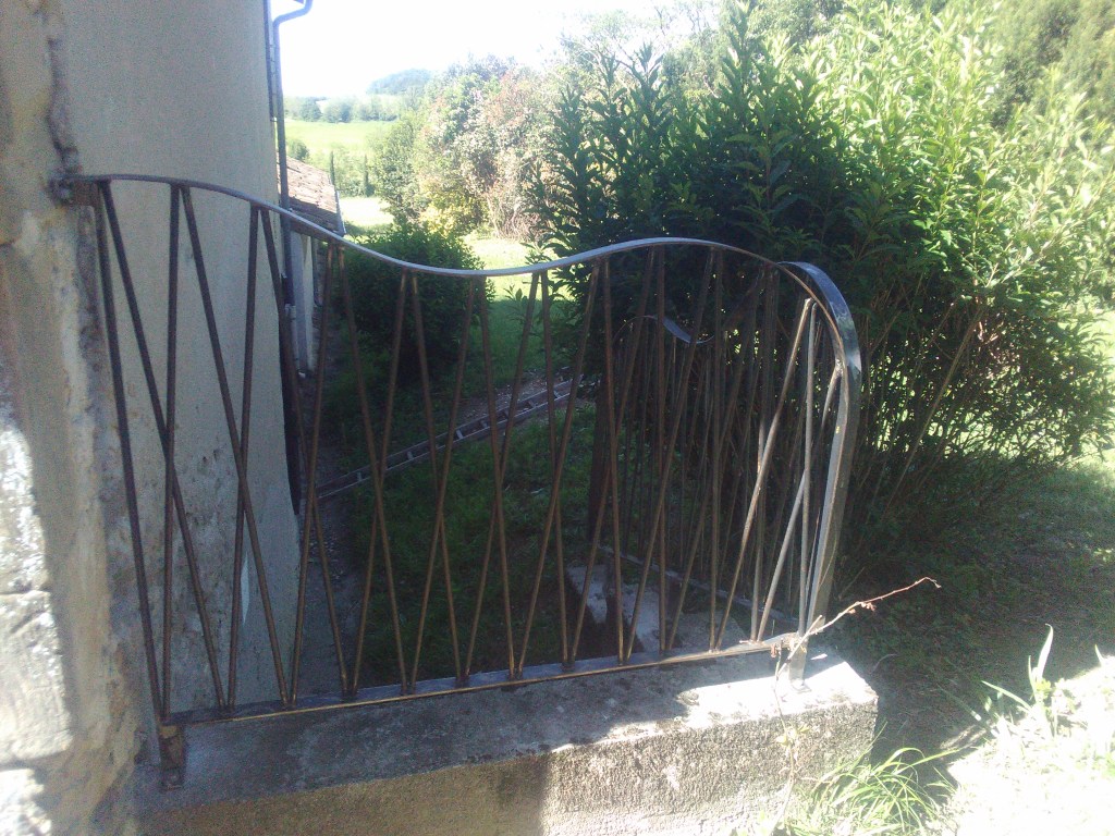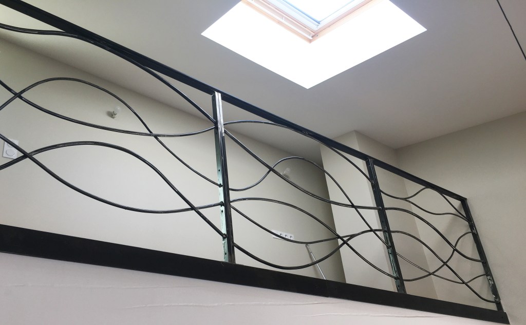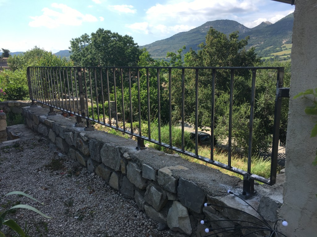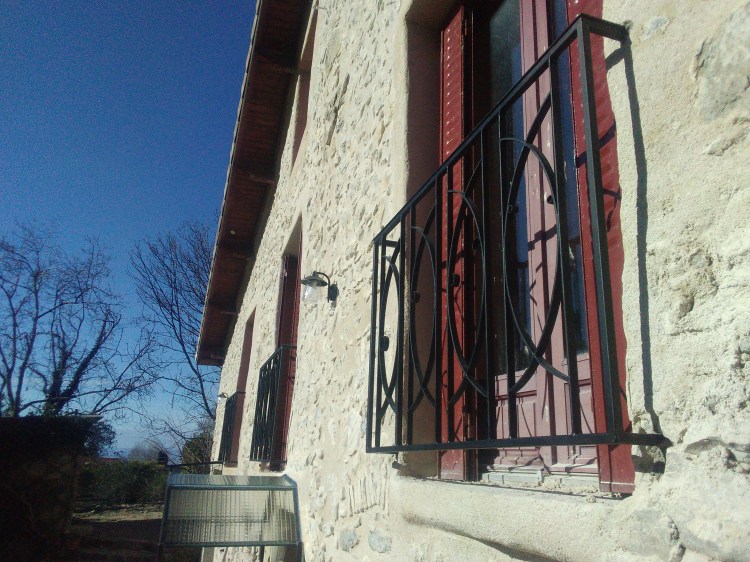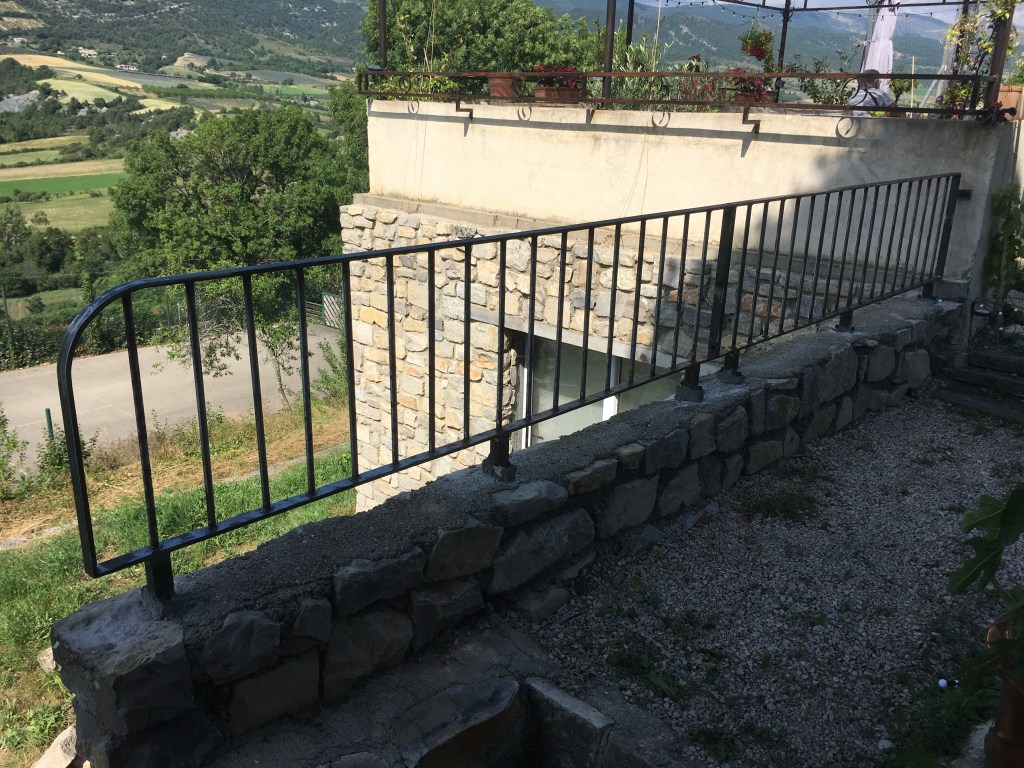 Un ensemble, garde-corps, main courante, balustrade de fenêtre, qui s’intègre dans la rénovation de cette ancienne maison en pierre. Les pièces ont été posées sans finition, qui sera réalisée par le client.