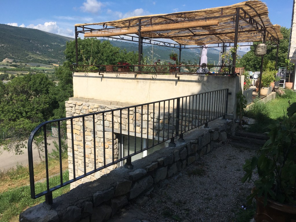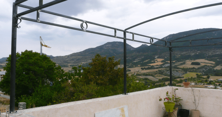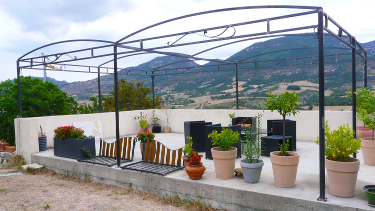Au coeur des Baronnies provençales, une terrasse se coiffe d’une pergola (7m x 5m). Elle va prendre son temps pour se patiner et être recouverte de verdure. Patience… Deux bancs complètent l’ensemble sur la même terrasse, pour papoter ou bouquiner.