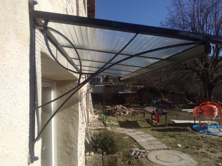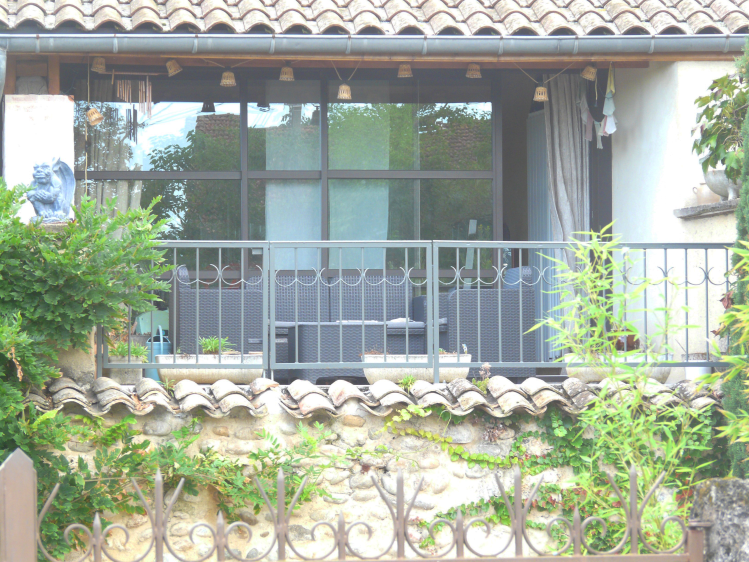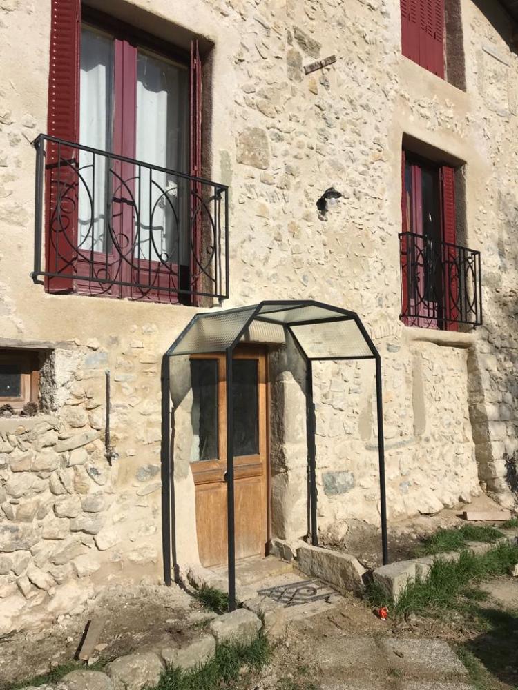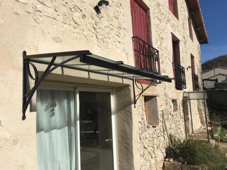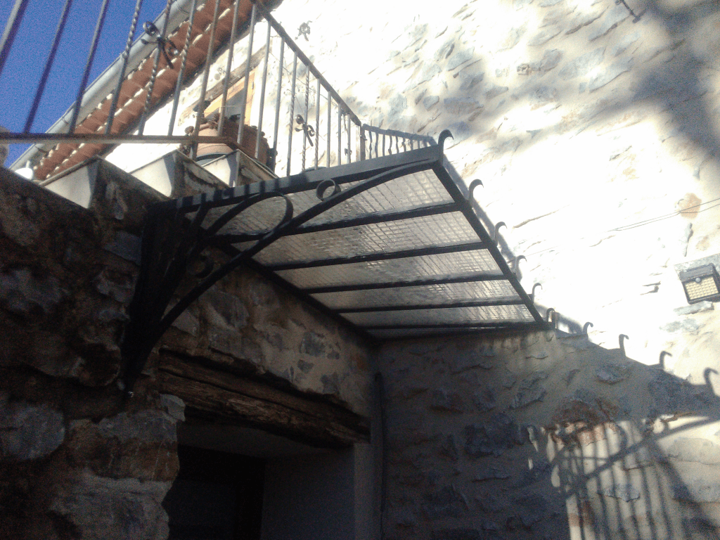 Un ensemble de trois garde corps de fenêtres, une marquise, et une mini pergola pour décorer, sécuriser et harmoniser la façade de cette maison ancienne qui vient de retrouver ses pierres apparentes
