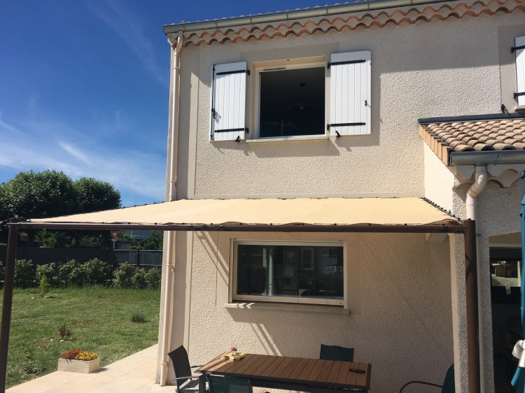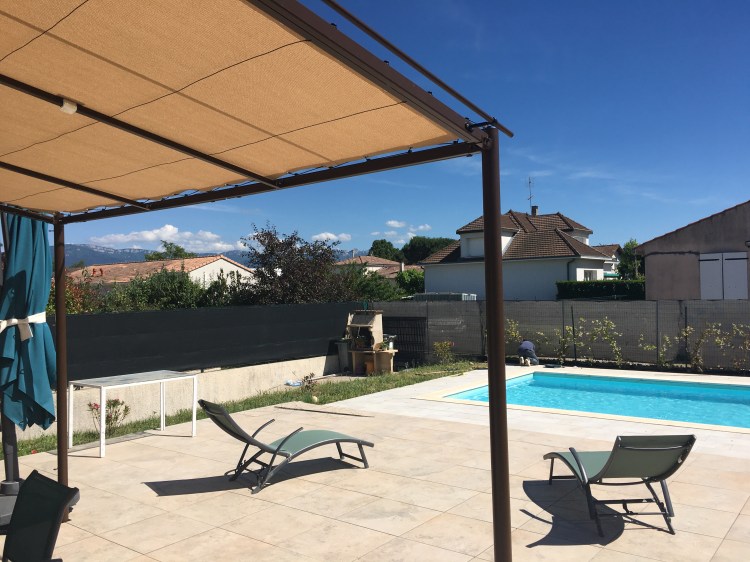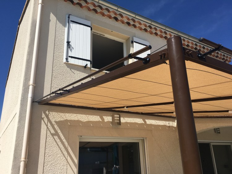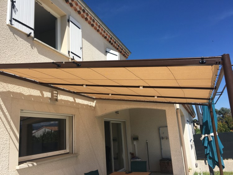 Une pergola aux lignes modernes et élégantes, une toile stretch isolante et rafraichissante, aux couleurs vanille et chocolat. Ça donne envie de manger une glace à l’ombre, puis de profiter de la piscine, non ?