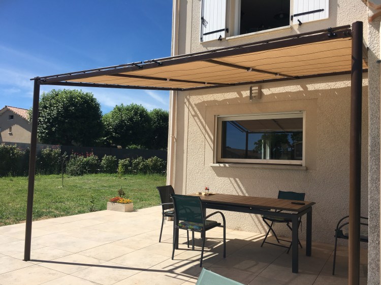 Une pergola toute simple, qui fait de l’ombre pour profiter des douceurs de l’été. Tous les éléments sont vissés, elle est donc entièrement démontable en 30 minutes.