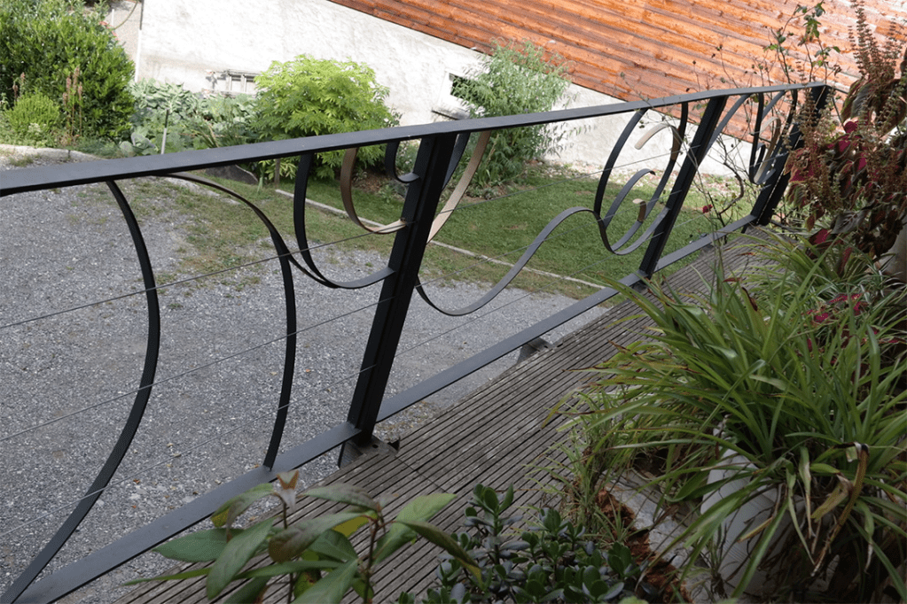 Une rambarde de terrasse aux motifs simples, peinte par thermolaquage, avec la possibilité de s’ouvrir à moitié.