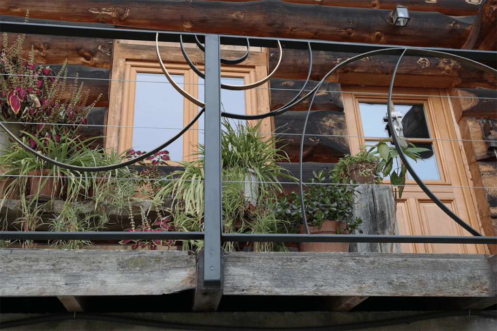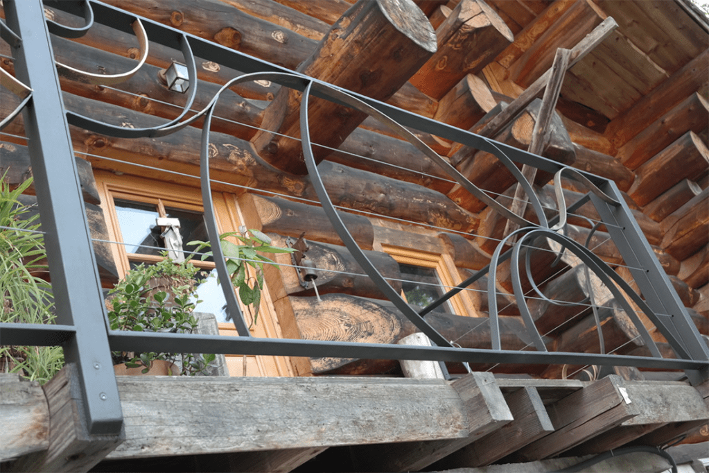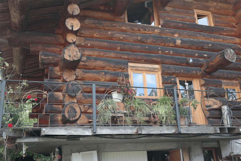 Une rambarde ensoleillée, pleine de rondeurs, particulière, à l’image du chalet en rondins qu’elle entoure et sécurise.