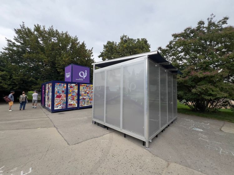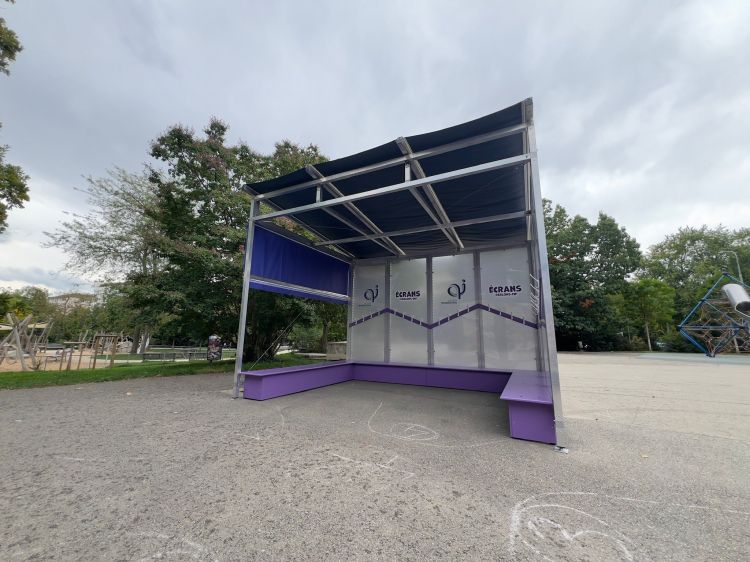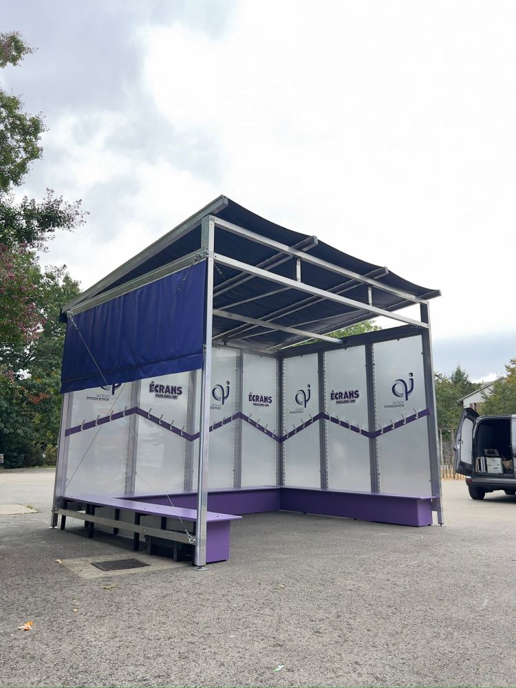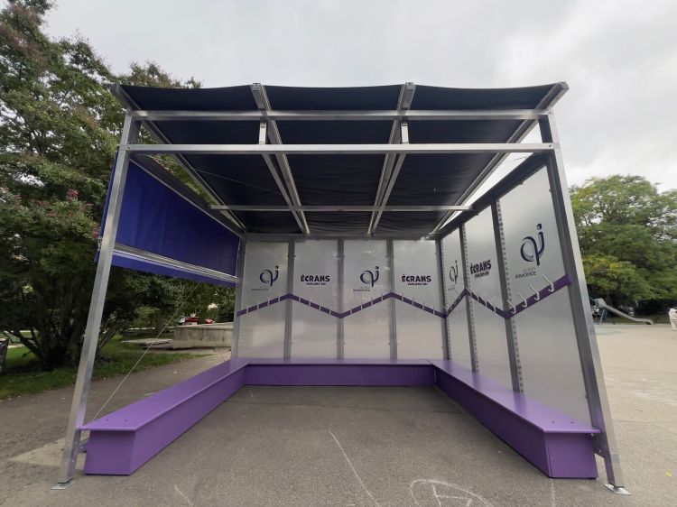 Structure en aluminium, entièrement démontable, qui sert de « salle d’attente » pour une exposition itinérante de la ville de Genève