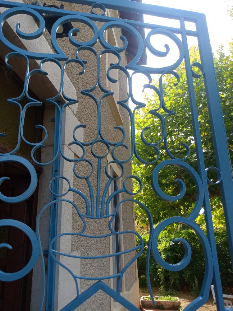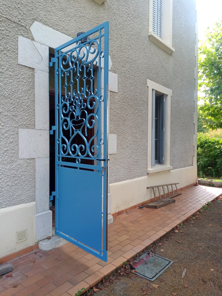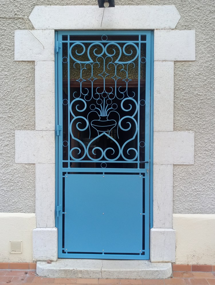 Une grille de sécurité aux motifs forgés, pour habiller et sécuriser l’entrée d’une maison de 1900. Serrure trois poins et peinture thermolaquage.