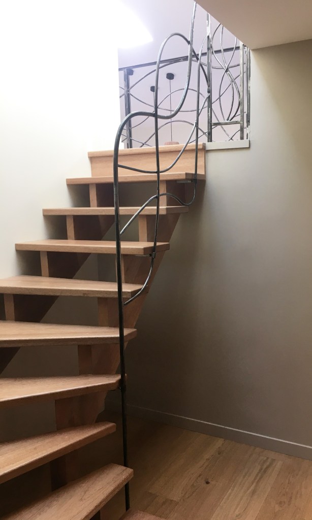 Un ensemble rampe d’escalier / garde-corps à la gloire des courbes sinusoïdales (page ferronnerie)